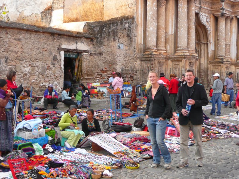 Agua volcano and a market in front of the old facade of a church